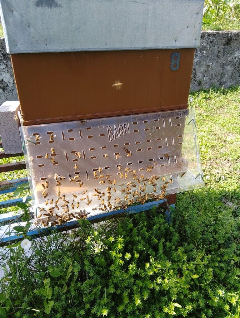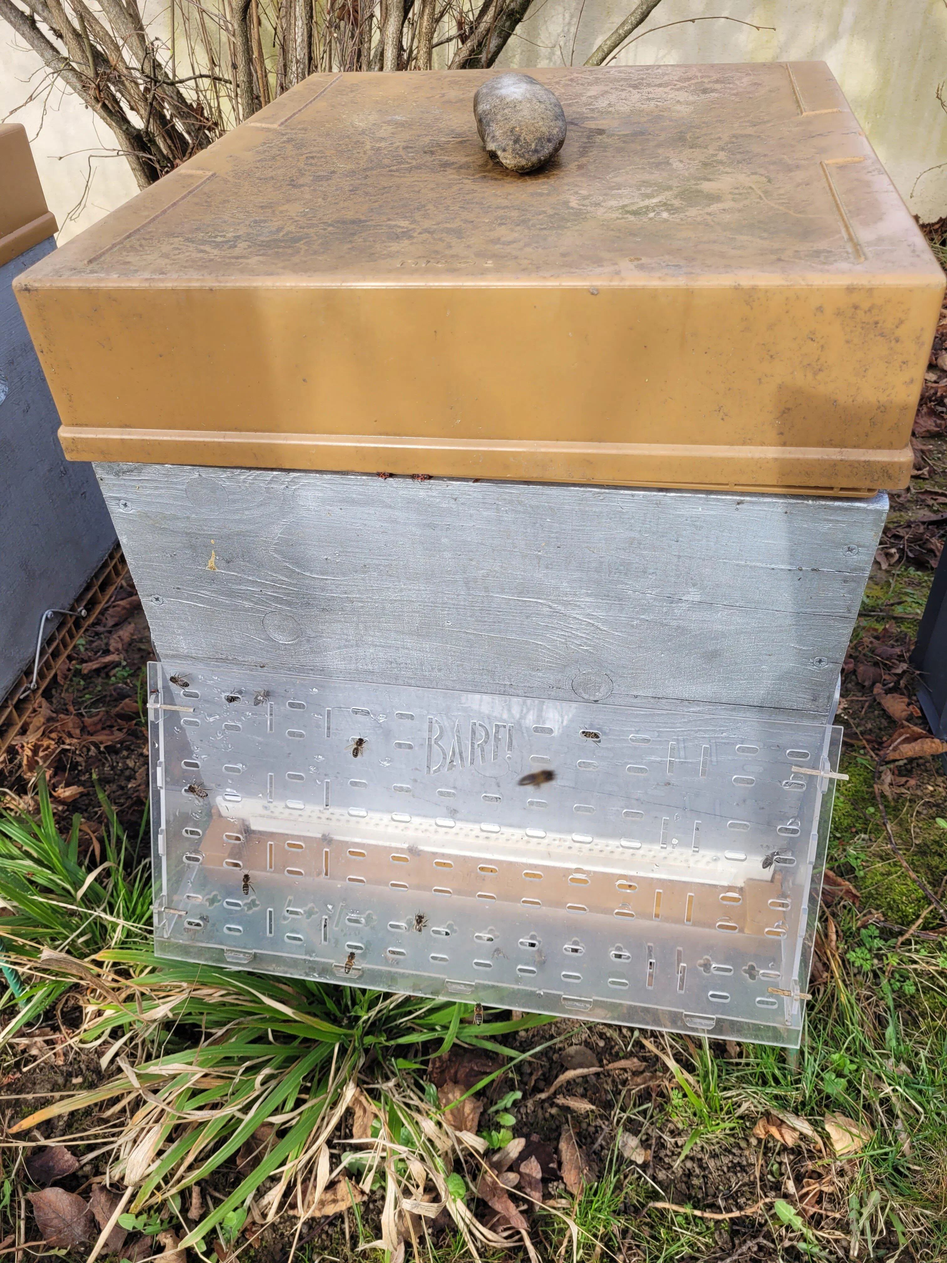 Le rucher école à qui j’ai proposé la muselière n’a pas pu l’installer, alors je l’ai installé sur l’une de mes ruches que j’ai pu surveiller quotidiennement ? Le dispositif se monte facilement et s’ajuste sans difficulté sur différents types de ruches. Sa transparence permet de garder une bonne visibilité sur la planche d’envol, ce qui facilite l’observation du comportement de la colonie et l’évaluation de son niveau de stress. Les abeilles s’y habituent rapidement. Les frelons continuent de chasser à proximité et se posent parfois sur la muselière, mais la colonie était globalement moins stressée par leur présence. La muselière remplit donc pleinement sa fonction. Pour information, la pression de prédation sur la ruche test était de 1 à 5 frelons simultanément devant la ruche.